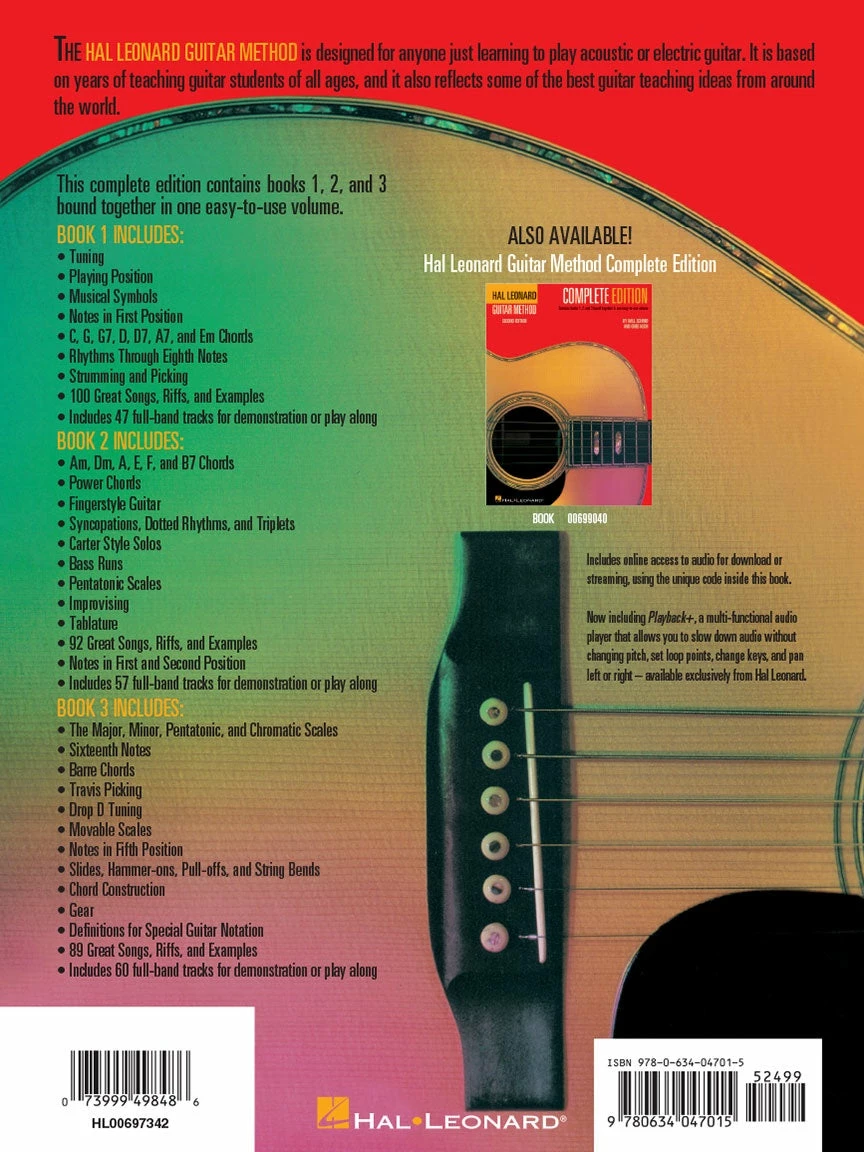 The Hal Leonard Guitar Method is designed for anyone just learning to play acoustic or electric guitar. It is based on years of teaching guitar students of all ages, and reflects some of the best teaching ideas from around the world. This super-convenient Complete Edition features the new and improved method books 1, 2 and 3 spiral-bound together. This edition includes online access to 164 full-band tracks for demonstration or play-along. The audio is accessed online using the unique code inside each book and can be streamed or downloaded. The audio files include PLAYBACK+, a multi-functional audio player that allows you to slow down audio without changing pitch, set loop points, change keys, and pan left or right.