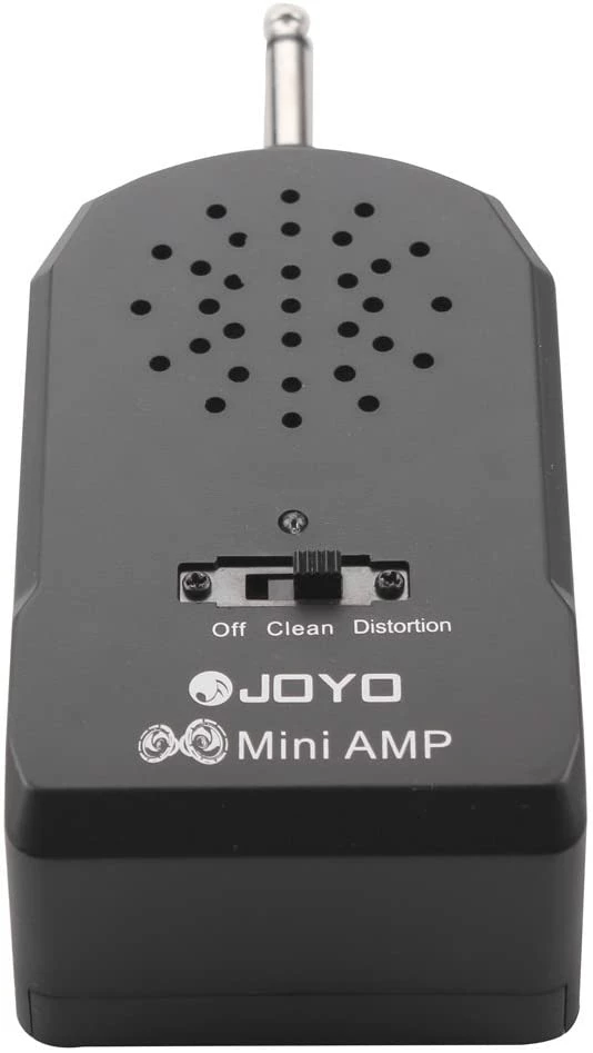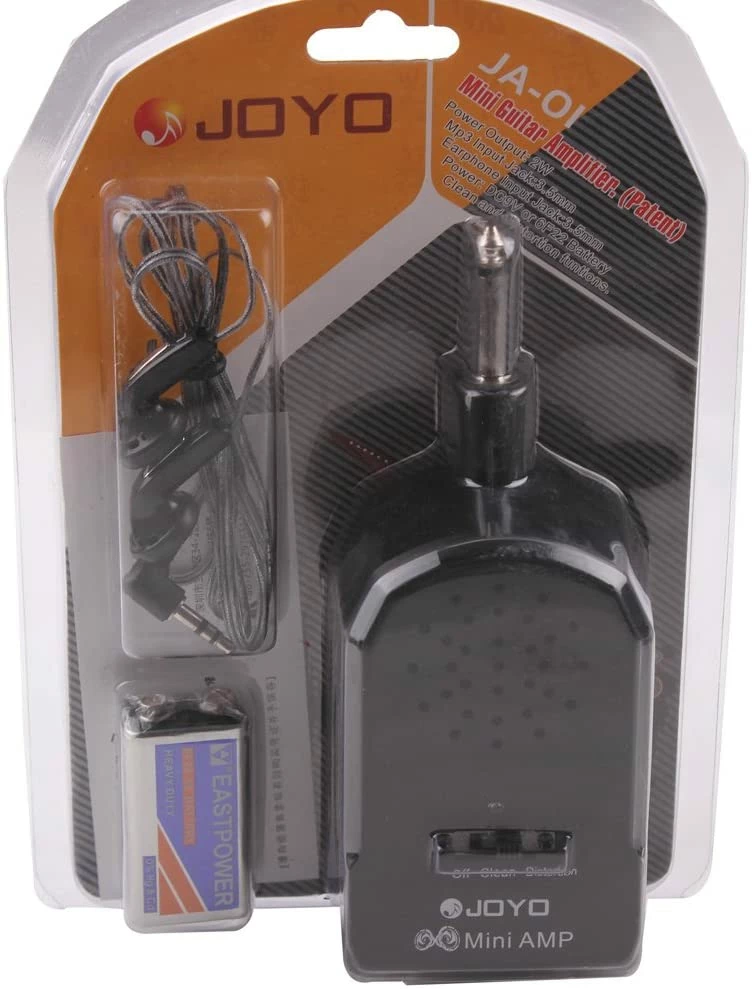 This neat looking mini JOYO guitar amplifier comes with 9V battery and headphones, offers two different sounds from clean to distortion and is portable with enough output to practice or bring outside and enjoy. This is really the most feature-packed and tone-VOLUME-enable little amp on the market.