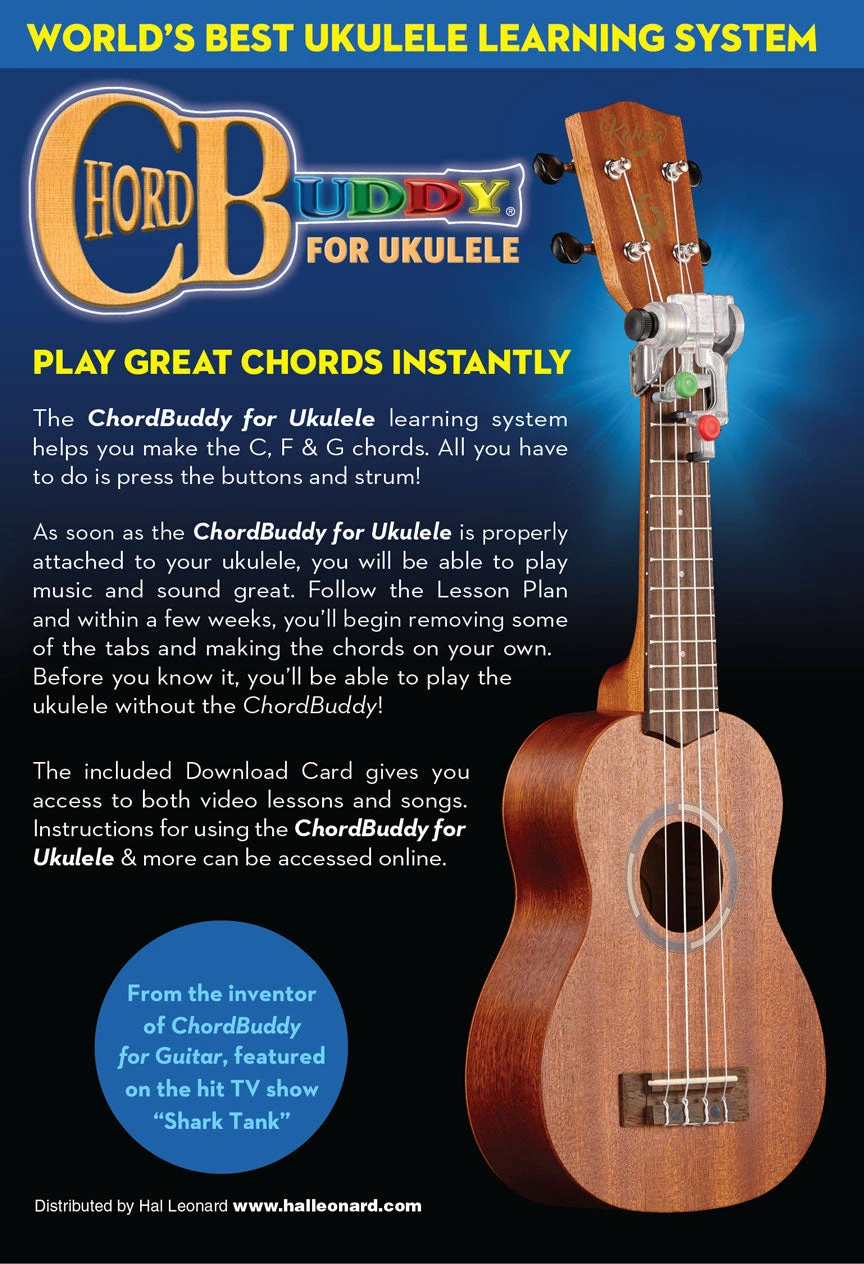 From the inventor of ChordBuddy for Guitar, as featured on the hit TV showย Shark Tank,ย comes ChordBuddy for Ukulele! Play great chords instantly! The ChordBuddy for Ukulele learning system helps you make the G, D, and C chords. All you have to do is press the buttons and strum! As soon as the ChordBuddy for Ukulele is properly attached to your ukulele, you will be able to play music and sound great. Follow the Lesson Plan and within a few weeks, you’ll begin removing some of the tabs and making the chords on your own. Before you know it, you’ll be able to play the soprano ukulele without the ChordBuddy! The included Download Card gives you access to both video lessons and songs. Instructions for using the ChordBuddy for Ukulele and more can be accessed online.