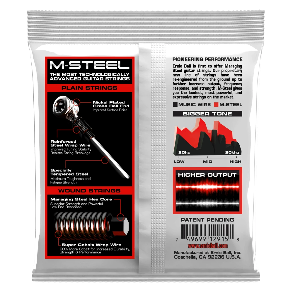 Ernie Ball M-Steel electric guitar strings are made of a patented Super Cobalt alloy wrapped around a Maraging steel hex core wire, producing a richer and fuller tone with a powerful low-end response. M-Steel plain electric guitar strings are comprised of a specially tempered steel for maximum fatigue resistance. The electric plain strings also utilize a patented winding of steel around the ball end that reduces slippage, breakage and stays in tune better than conventional plain strings. Gauges .010, .013, .017, .030, .042, .052
