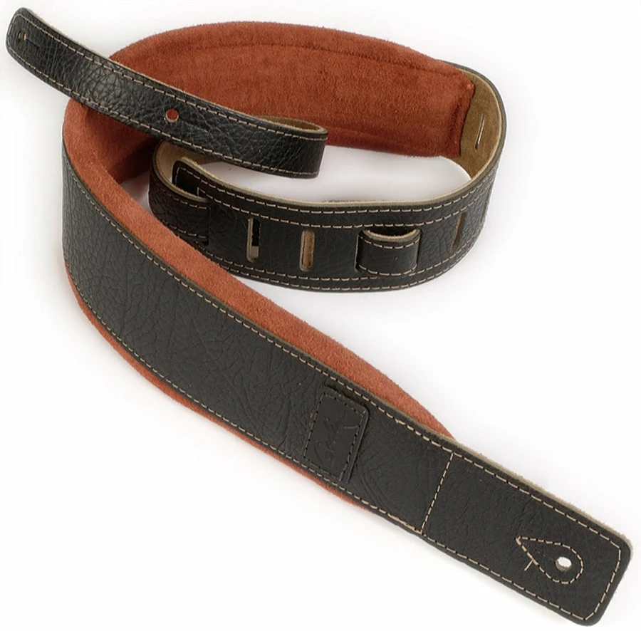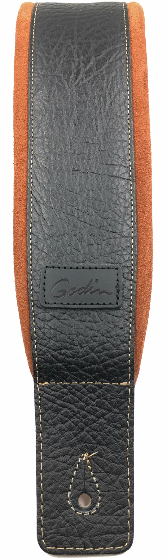 Godin Black Leather/Rust Suede Guitar Strap 026081 This Godin guitar strap with embossed Godin logo features the comfort and quality of its durable premium stitched black leather strap and cushioned rusted suede shoulder padding. (One size fits all)