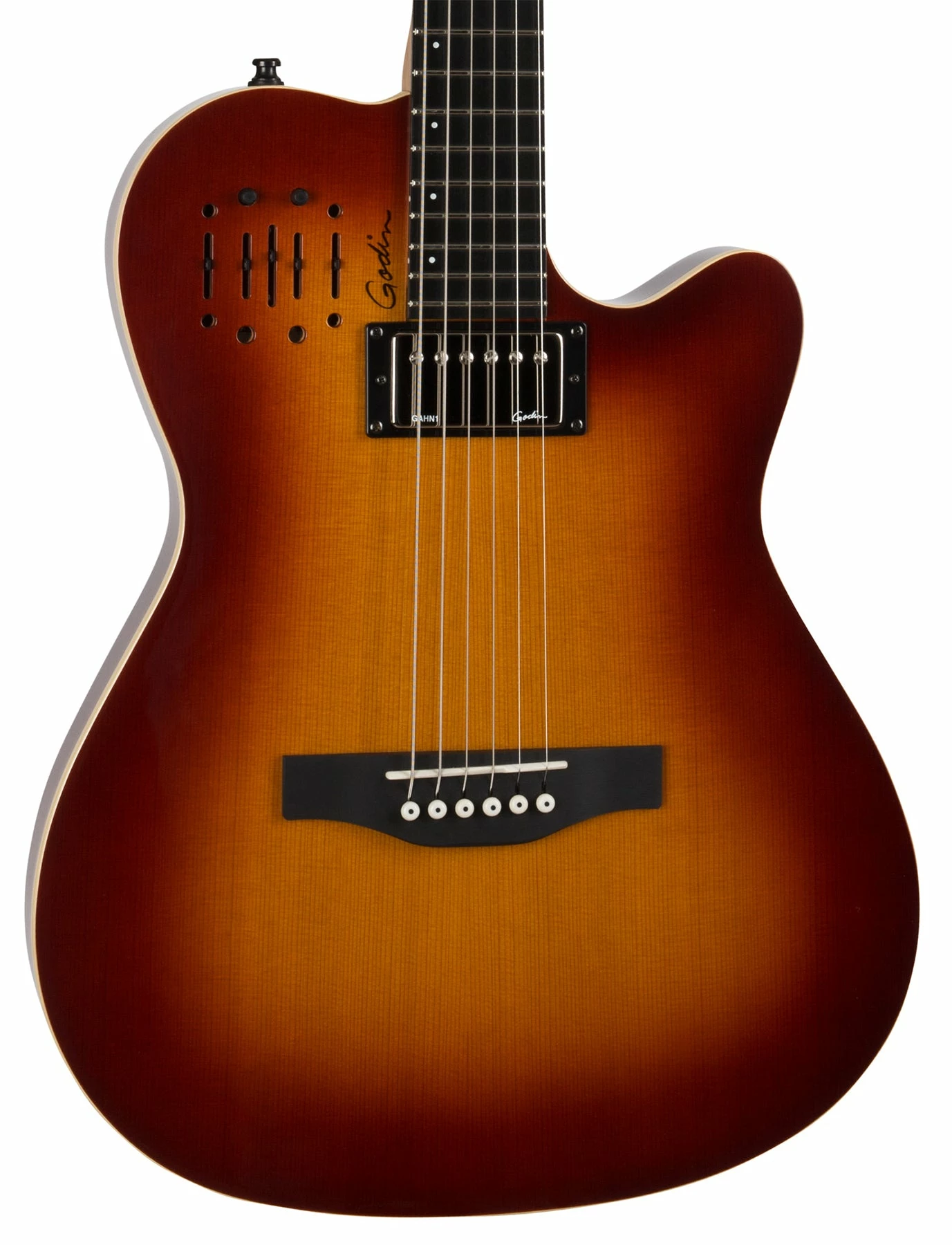 These features stand true and better than ever in the A6 Ultra with the added “Oomph!” and full tone of a Godin humbucker in the neck position, along with an under-saddle transducer, dual outputs (acoustic and electric) that combine for a huge sound and a Custom Godin preamp section voiced specifically for the A6 Ultra. This preamp section gives a player the chance to control their tone via sliders for acoustic volume, treble, mid, bass and independent controls for the electric humbucker volume, treble and bass.