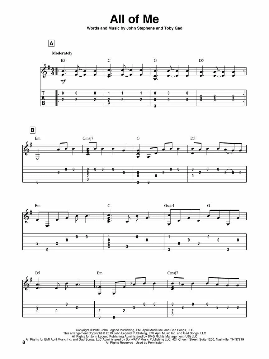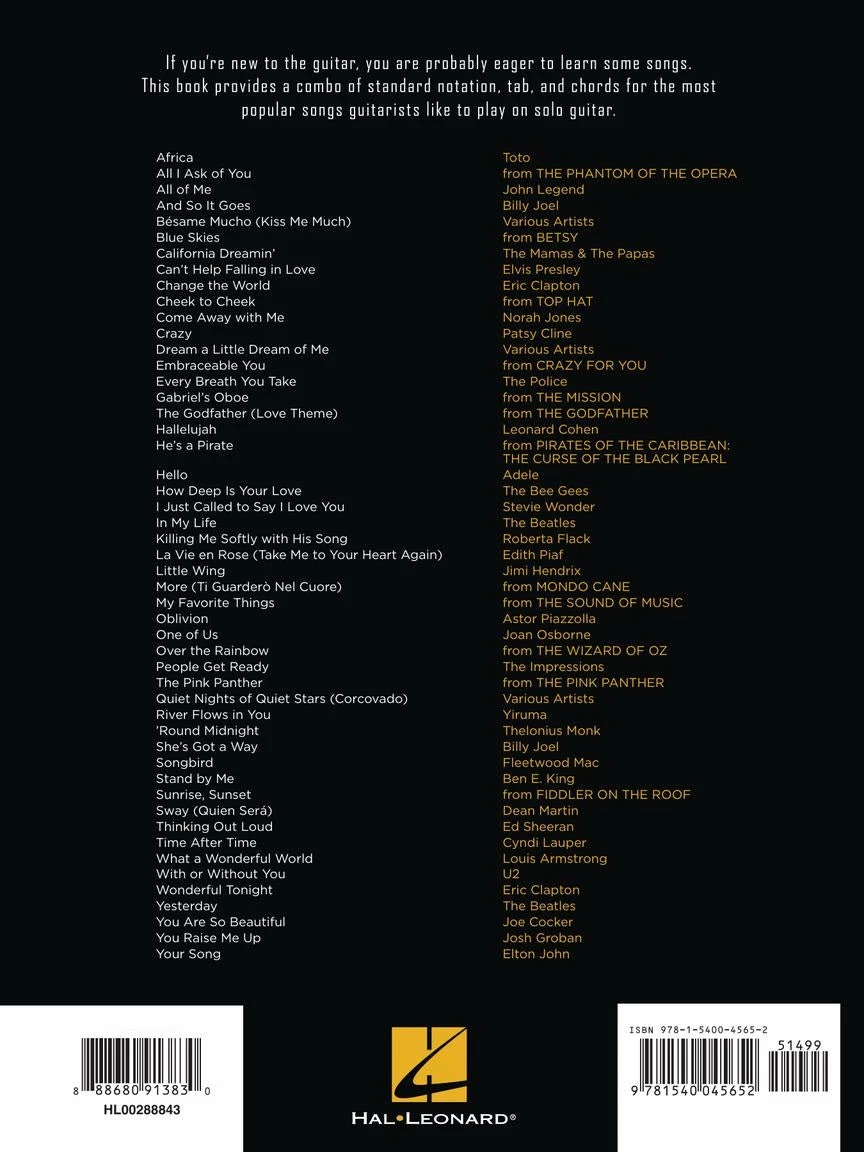 So you’ve had some guitar lessons and are ready to branch out to play the music you want to play … now what? This songbook should be the perfect fit for you! It features 50 favorite pop and jazz standards arranged for beginners to give you the confidence and encouragement to keep moving forward with your lessons. Songs include: Africa โข All of Me โข Blue Skies โข California Dreamin’ โข Change the World โข Crazy โข Dream a Little Dream of Me โข Every Breath You Take โข Hallelujah โข Hello โข Killing Me Softly with His Song โข La Vie En Rose (Take Me to Your Heart Again) โข My Favorite Things โข Over the Rainbow โข The Pink Panther โข River Flows in You โข Stand by Me โข Time After Time โข Wonderful Tonight โข Yesterday โข You Raise Me Up โข Your Song โข and more.