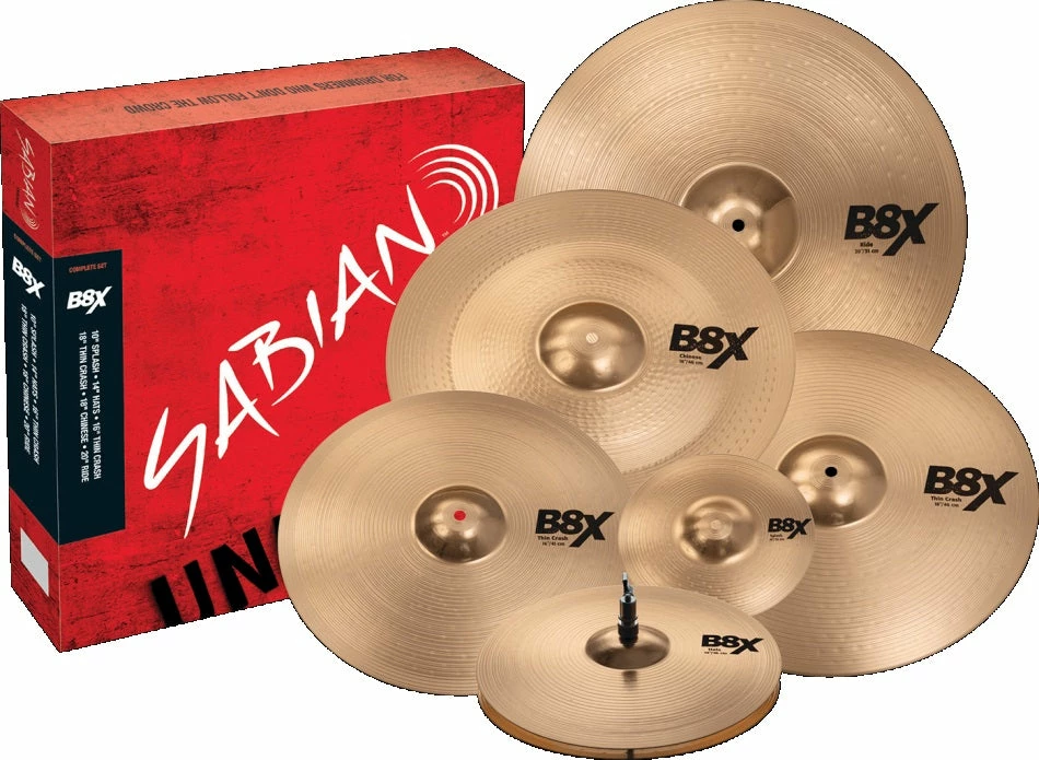 Sonically matched in the SABIAN Vault, the SABIAN B8X Complete Set includes a 10″ B8X Splash, 14″ B8X Hats, 16″ B8X T-Crash, 18″ B8X T-Crash, 18″ B8X Chinese and a 20″ B8X Ride. The perfect complete set for the discerning beginner ready to hit the stage. Precision formed, hammered and lathed for pure, tonally tight sounds, B8X is the bright, cutting sound of pure Bronze โฆ at a low price that makes your first move into this precious metal an easy one.