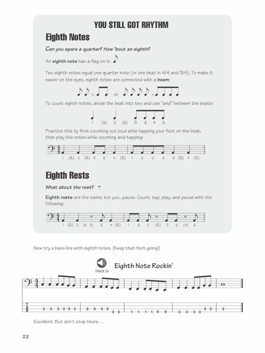 Everything you need to know about playing the bass, including music notation, tablature, riffs, licks, and scales, syncopation, and rock and blues styles. Method Book 1 includes 75 songs and examples. Audio examples accessed online for download or streaming.
