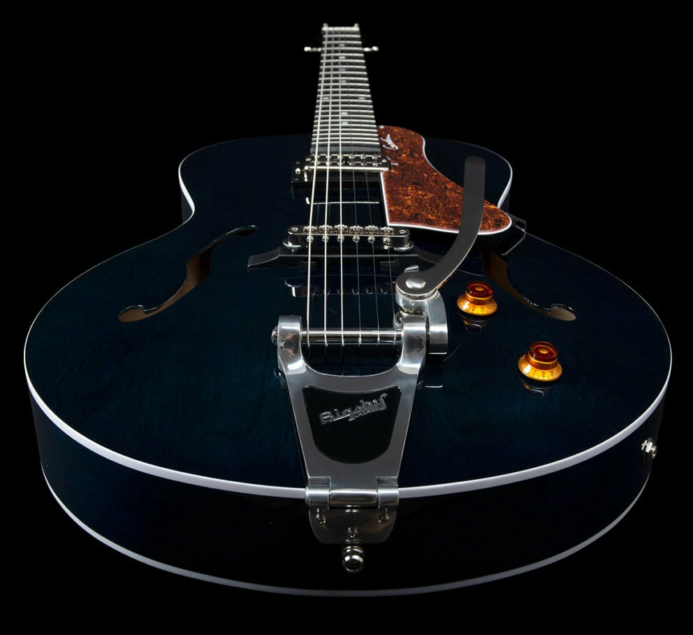 The 5th Ave Night Club can be described by one word: Classy. Adorned in a stunning Indigo Blue finish, this guitar is not only a treat to look at but has awesome playability and a rich tone that matches its beauty. No detail is spared with this model – from the all-high gloss body, the tortoise brown pick guard, and the vintage style volume and tone knobs. The single TV Jones Classic pickup is perfectly suited for Jazz and Blues and the inclusion of a Bigsby tremolo bridge lets you take this guitar to a variety of musical directions.