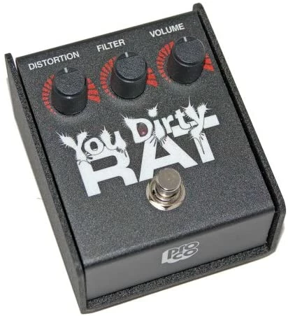 The You Dirty RAT features the legendary RAT Filter control. Turn it to the right to roll off brittle high-end frequencies. Having trouble cutting through the mix? Turn the Filter down and allow the natural brightness of your instrument to shine through. The Distortion and Volume controls dial in the perfect amount of gain while keeping the level consistent with your clean tone. While thereโs no mistaking the legendary RAT tone when the pedal is on, true bypass switching guarantees that no extra noise will creep into your signal when itโs turned off.